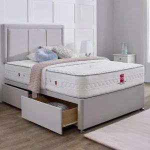 The divan bed and headboard feature 4 elegantly positioned chrome gliders as feet, along with chrome detailing on the divan base itself, adding a touch of sophistication and style to your bedroom. The set includes a luxury mattress of your choice and comes complete with a hand-crafted, pleated strutted headboard.