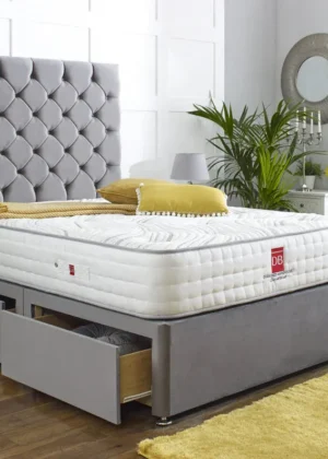 The divan bed and headboard feature 4 elegantly positioned chrome gliders as feet, along with chrome detailing on the divan base itself, adding a touch of sophistication and style to your bedroom. The set includes a luxury mattress of your choice and comes complete with a hand-crafted, pleated strutted headboard.
