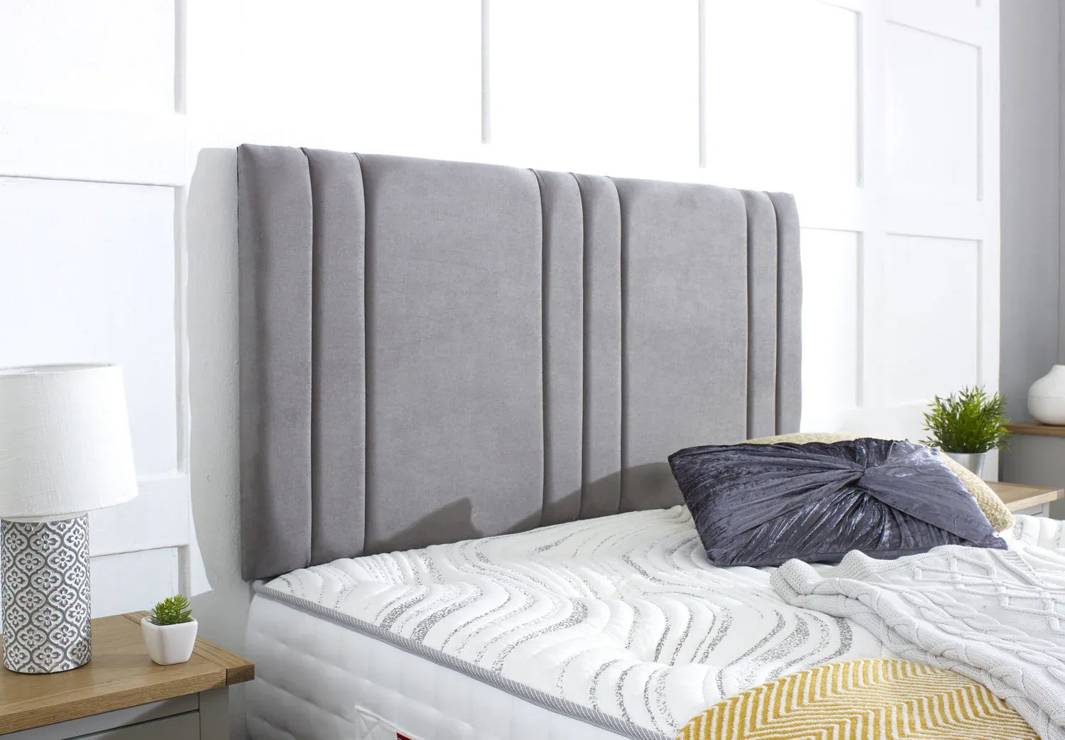 The divan bed and headboard feature 4 elegantly positioned chrome gliders as feet, along with chrome detailing on the divan base itself, adding a touch of sophistication and style to your bedroom. The set includes a luxury mattress of your choice and comes complete with a hand-crafted, pleated strutted headboard.