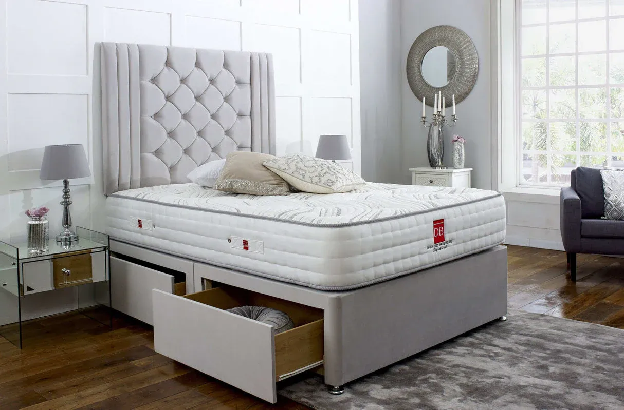 The divan bed and headboard feature 4 elegantly positioned chrome gliders as feet, along with chrome detailing on the divan base itself, adding a touch of sophistication and style to your bedroom. The set includes a luxury mattress of your choice and comes complete with a hand-crafted, pleated strutted headboard.